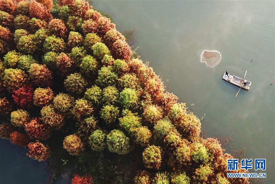 初冬时节,江苏省淮安市盱眙县天泉湖内的红杉林枝叶飘红,别有一番韵味。