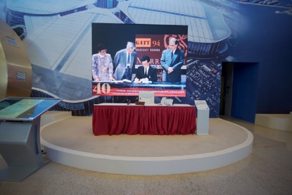 在本次展览中,通过设置加入世界贸易组织(WTO)签字桌、椅子、议定书、签字笔等历史文物(仿制品)还原当时的签字场景。 LED大屏幕循环展示15张加入WTO场景照片。