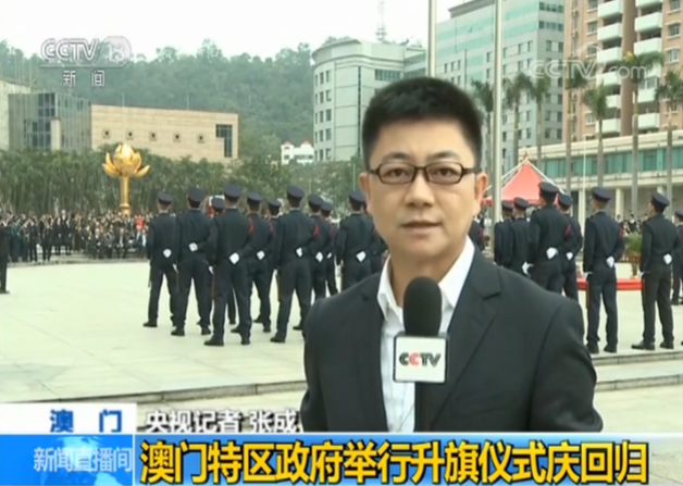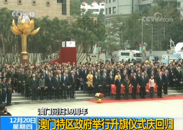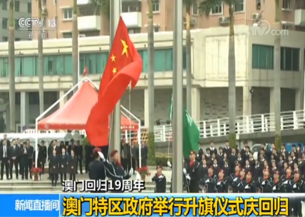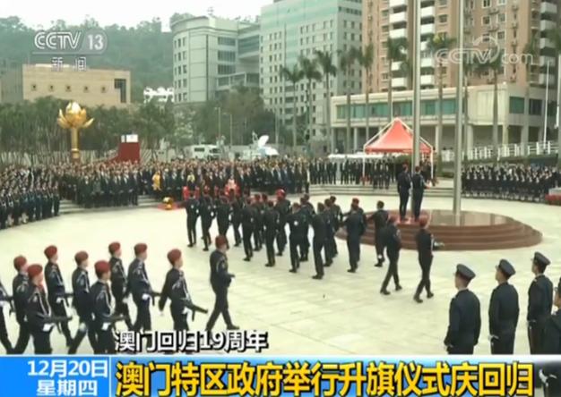 央视记者 张成:这里是澳门的金莲花广场,20日早上8点整,澳门特区政府和社会各界在这里举行隆重的升旗仪式,庆祝澳门回归祖国19周年。
