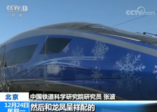 中国铁道科学研究院研究员 张波:我们综合考虑中国元素和奥运元素,设计了两款图形,一款叫瑞雪迎春,蓝底有雪花的图案。另一款涂装叫龙凤呈祥,这两个图形略有区别。瑞雪迎春配的图形是相对于旗鱼的造型,龙凤呈祥配的是叫鹰隼的造型。