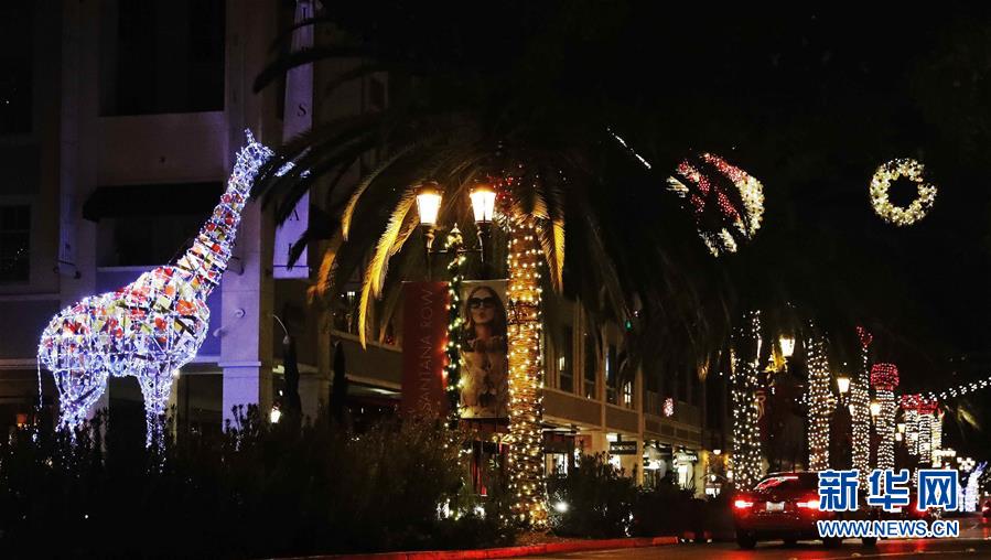 12月23日,在美国加利福尼亚州圣何塞,商业街布置起圣诞主题装饰。 圣诞节和新年将至,旧金山湾区各地的商家和居民喜迎节日。 新华社发(董旭东 摄)