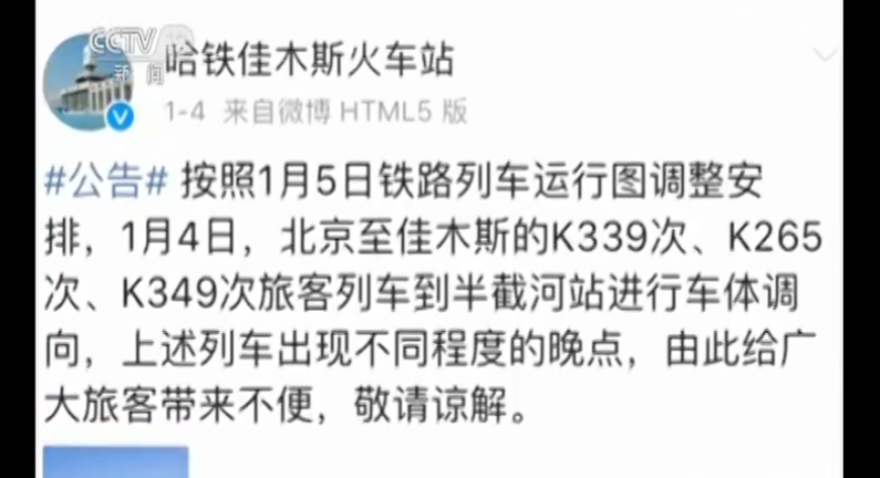 当在晚上,哈铁佳木斯火车站通过官方微博,针对因列车运行图调整出现的晚点情况,发布了致歉声明。6号下午,记者就此采访了哈尔滨铁路局集团公司相关负责人。