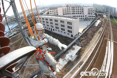 央视网消息:在1000千伏特高压交流输变电山东段,王进带领工友们进行通电前的最后验收。从地面到塔顶接近60层楼的高度,王进要借助于886根攀爬脚钉,徒手攀爬上去。