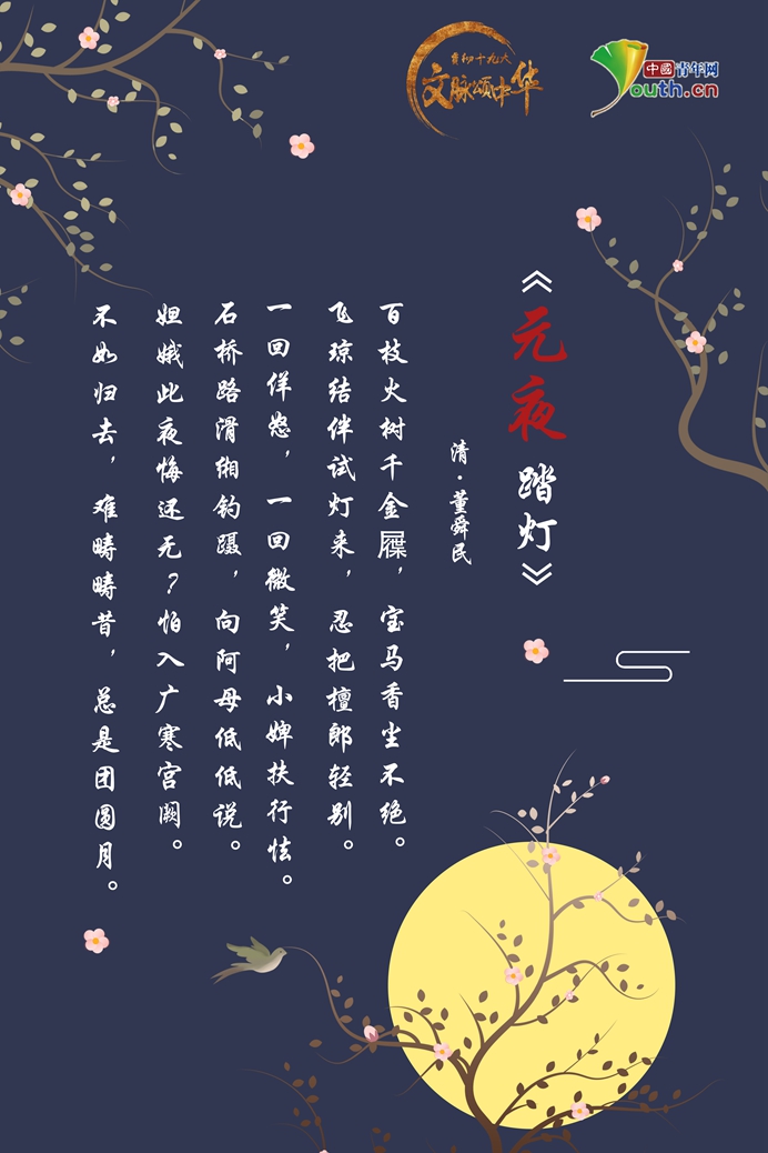 中国青年网北京2月19日电(记者 叶婉莹 实习记者 谭聪)“爱元宵三五风光,月色婵娟,灯火辉煌。”今天是一年一度的元宵佳节。元宵节又称“上元节”,除了吃汤圆、猜灯谜等风俗,古代文人们更是留下了许多“惊艳时光”的诗词。今天就让我们一起穿越时光,品味诗歌经典,过一个充满诗意的元宵佳节吧!