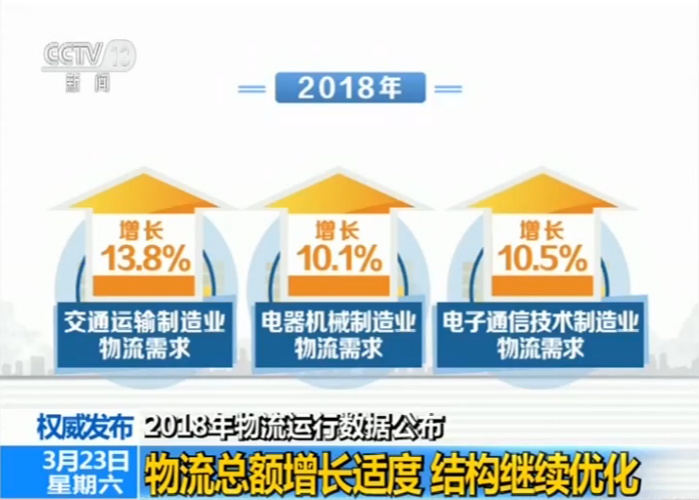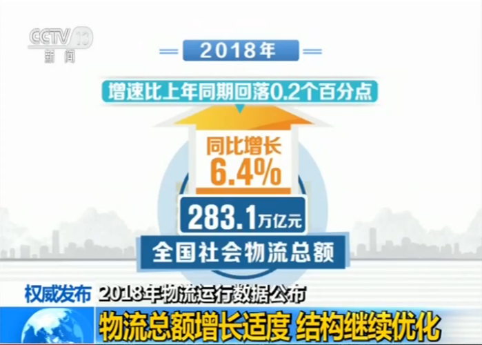 (原标题:2018年全国社会物流总额283.1万亿元 同比增6.4%:增长适度 结构继续优化)