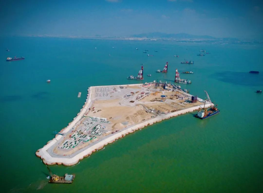 当日,伶仃洋面上,只见繁忙的航运船与种类繁多的施工船有序航行,而风筝状的西人工岛已初露芳容。岛体钢圆筒振沉施工及岛内回填已完成,其面积相当于19个足球场大,由57个直径为28米的钢圆筒构成,每个钢圆筒相当于14层楼高。