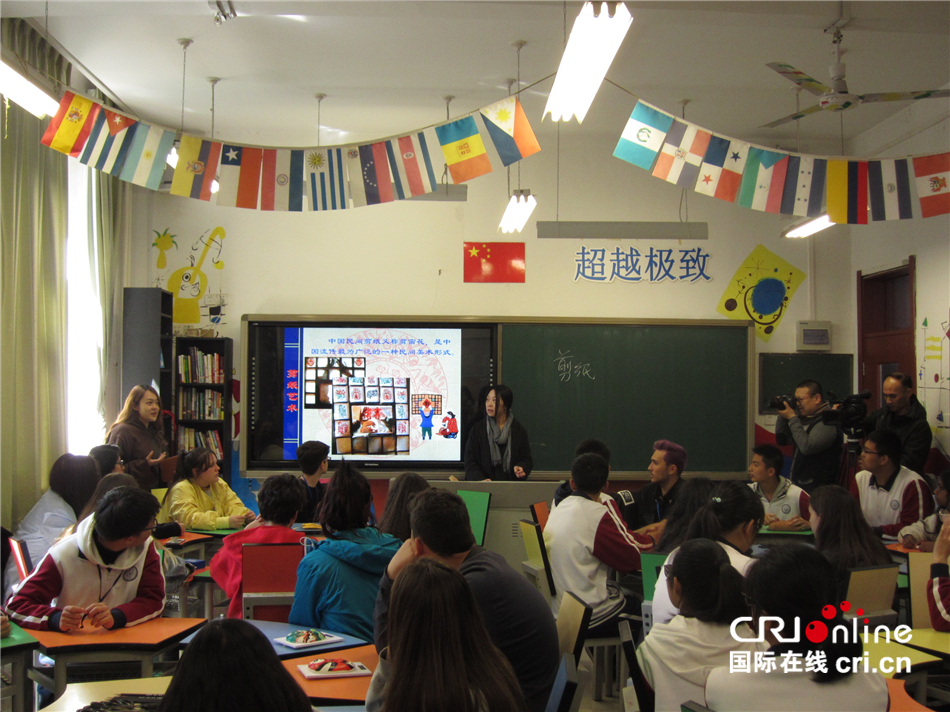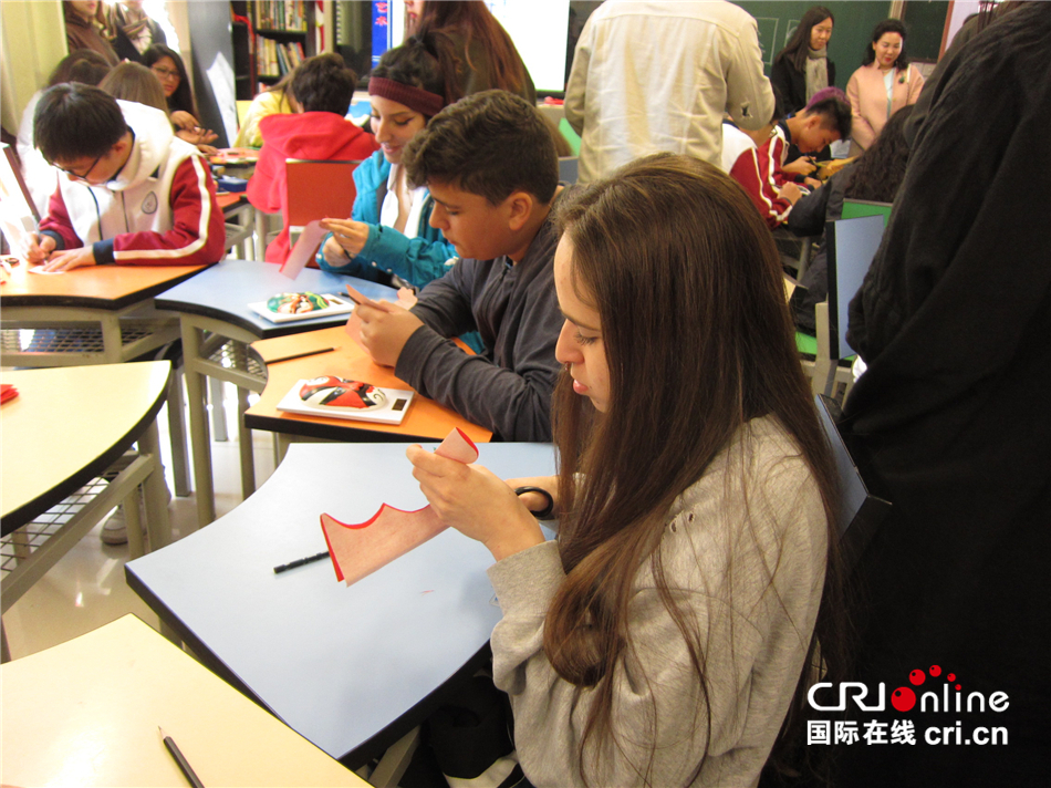 国际在线报道(记者 陈宇):4月10日上午,来自西班牙马德里圣伊西德罗中学的师生在北京市古城中学与该校学生一起感受中国剪纸艺术的魅力。