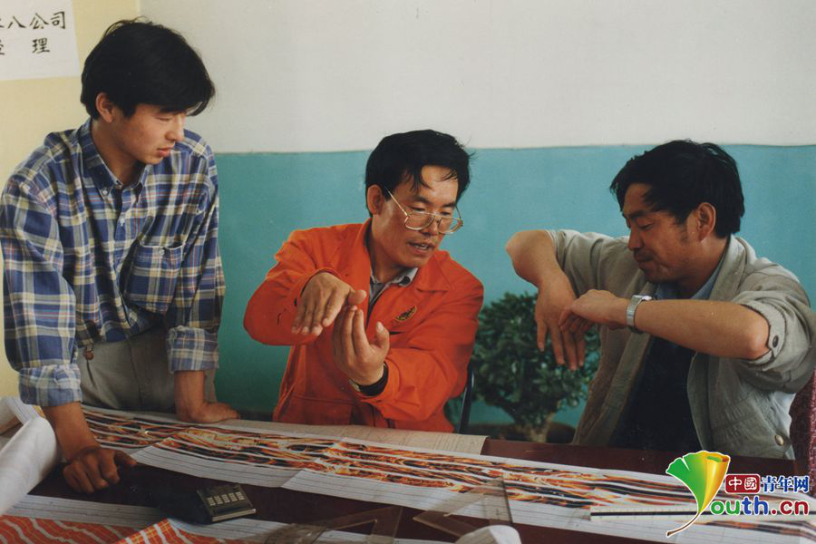 秦文贵(左二)钻研钻采技术。本人供图