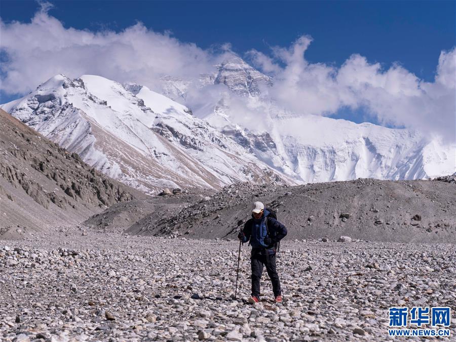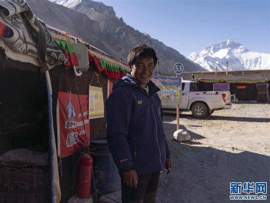 益格站在他经营的帐篷旅馆前,益格后方山峰为珠穆朗玛峰(4月28日摄)。新华社发(孙非摄)