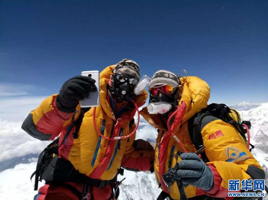 珠穆朗玛峰顶,王银龙向关娴求婚(2018年5月16日摄)。新华社发