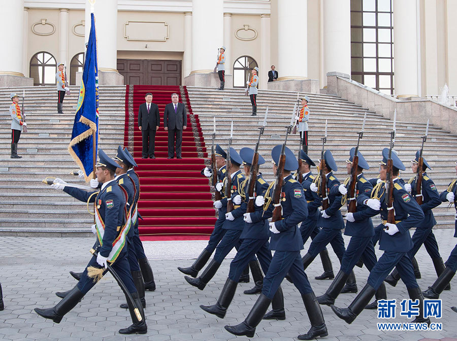 会谈前,拉赫蒙在总统府前广场为习近平举行了盛大欢迎仪式。