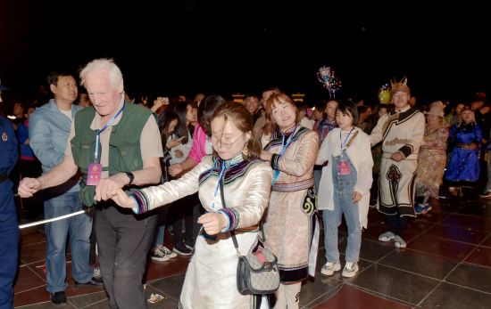 6月18日,中外游客加入到鄂伦春篝火节狂欢中。 侯玉鹏 摄。