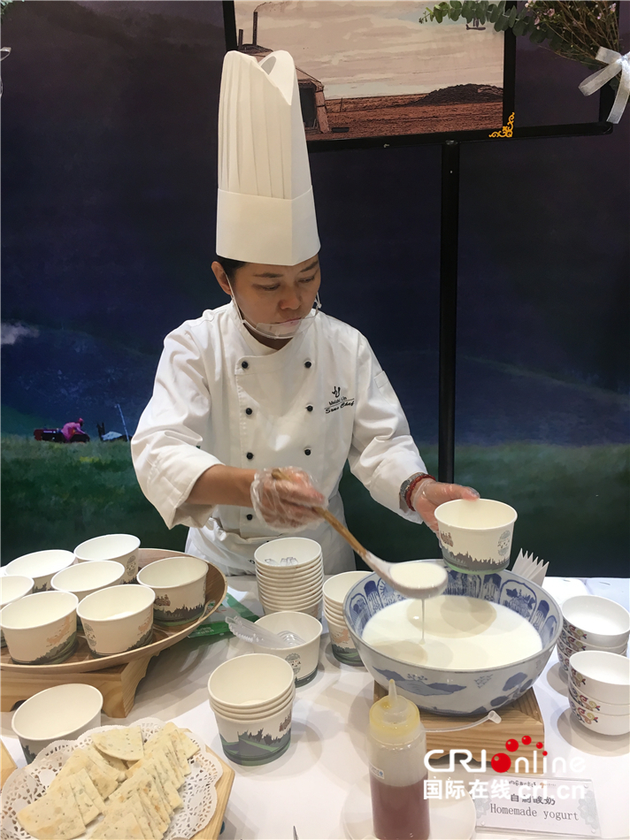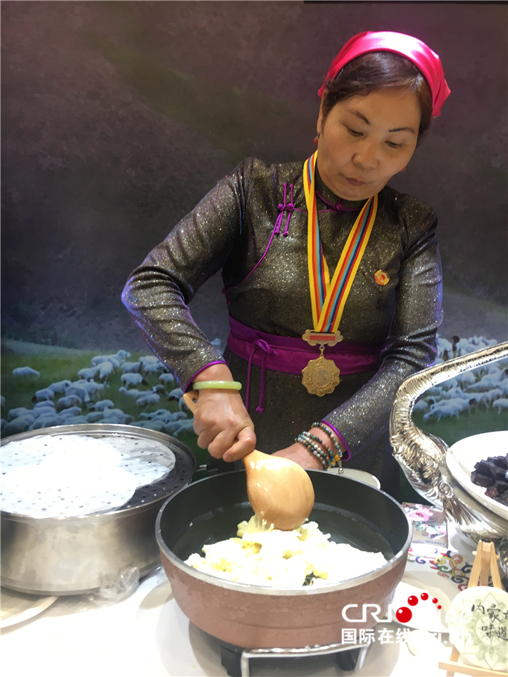 来自锡林郭勒的“查干伊得”制作非物质文化遗产传承人陶高在现场架起小锅炒制这种蒙古族传统奶制品,飘出的奶香味让人对草原生活心驰神往。她告诉记者,牛奶在蒙族人的饮食中具有重要作用,“这是纯牛奶做的食品,蒙古奶酪。主要原材料是牛奶,而牛奶是既可以(做成奶制品)吃,又能当饮料喝,功能性很强。”