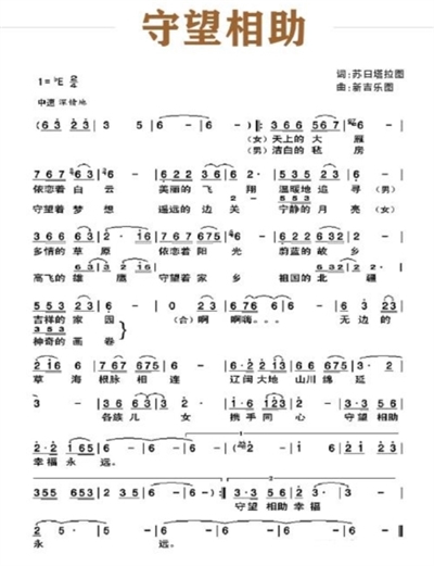 歌曲《守望相助》由苏日塔拉图作词,著名作曲家新吉乐图作曲,创作于2014年。歌曲创作灵感源于习近平总书记考察内蒙古时对内蒙古各族人民的殷殷嘱托。此作品歌词表达豪迈大气,曲风清新,立意高远,既富有草原歌曲的悠扬深情,又不失时代特色,曾荣获第十二届自治区“五个一工程奖”“乌兰夫基金民族文化艺术奖”。