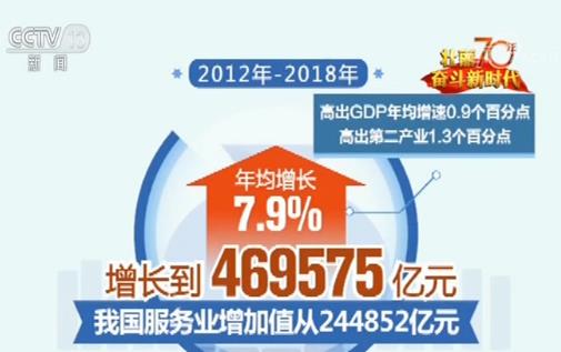 党的十八大以来,服务业发展进入新阶段,推出了一系列改革举措来培育和促进服务业新经济、新动能的发展不断壮大。数据显示,2012-2018年,我国服务业增加值从244852亿元增长到469575亿元,年均增长7.9%,高出GDP年均增速0.9个百分点,高出第二产业1.3个百分点。服务业在国内生产总值中的比重进一步上升,6年提高了6.7个百分点,2015年超过50%,2018年达到52.2%,占据国民经济半壁江山。