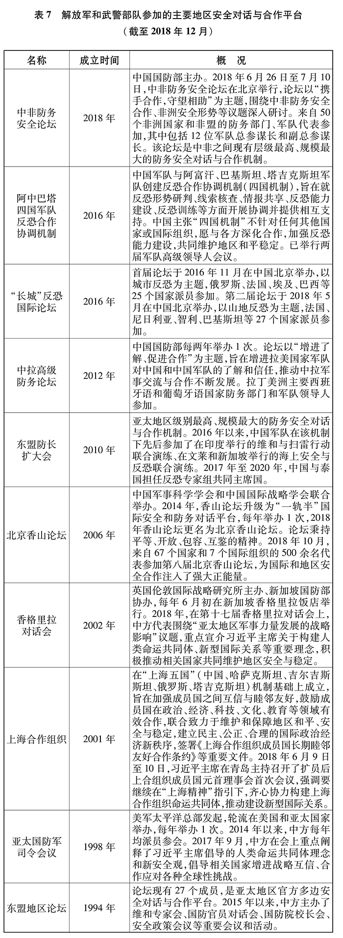 中国加强同非洲、拉美和加勒比、南太平洋等地区发展中国家的军事交往,开展人员培训和中青年军官交流,帮助有关国家加强军队建设、提高防御能力。2018年,在北京举办中非防务安全论坛、中拉高级防务论坛、中加(勒比)南(太平洋)高级防务研讨班。