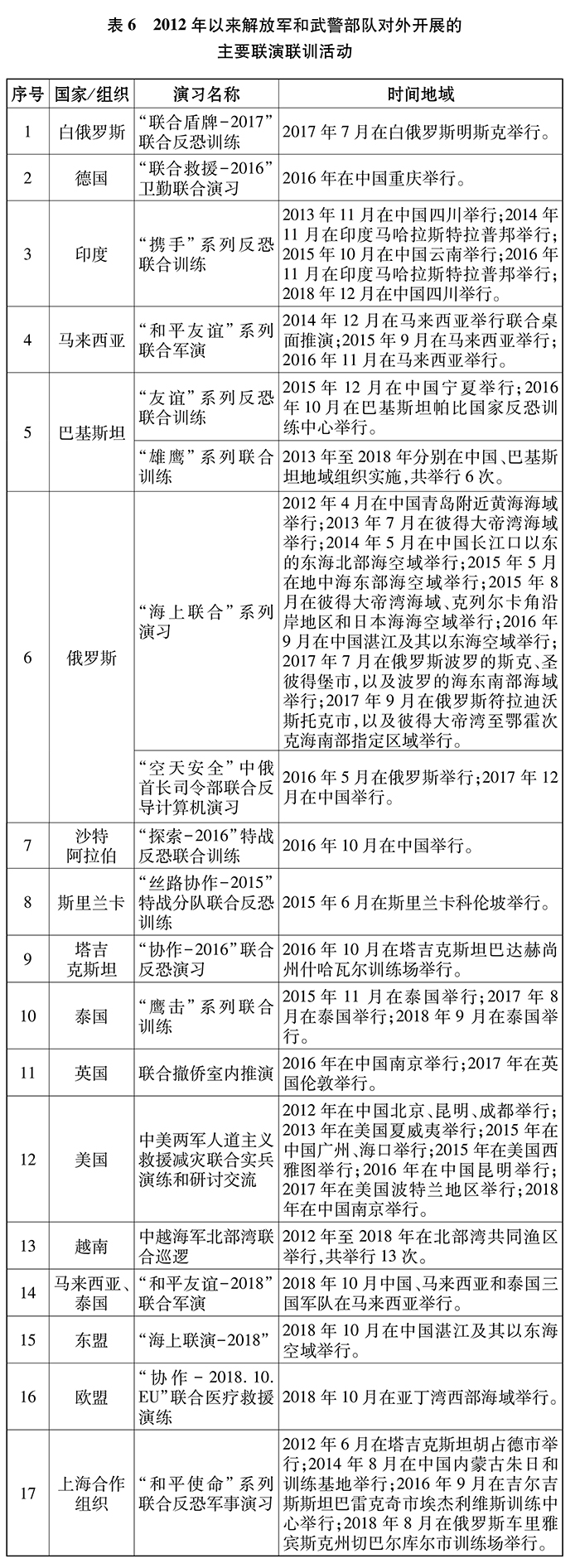 中国军队坚持互信互惠、合作共赢的原则,同世界各国军队开展务实交流合作。2012年以来,中国同30多个国家举行百余次联合演习与训练,演练内容从非传统安全领域发展到传统安全领域,演练地域从中国周边延伸至远海,参演力量从以陆军为主拓展至陆海空多军兵种。中国军队积极组织人才培养交流合作,2012年以来,向50多个国家派出军事留学生1700余名,20余所军队院校分别同40多个国家的院校建立和保持了校际交流关系,共接纳130多个国家的上万名军事人员到中国军队院校学习。