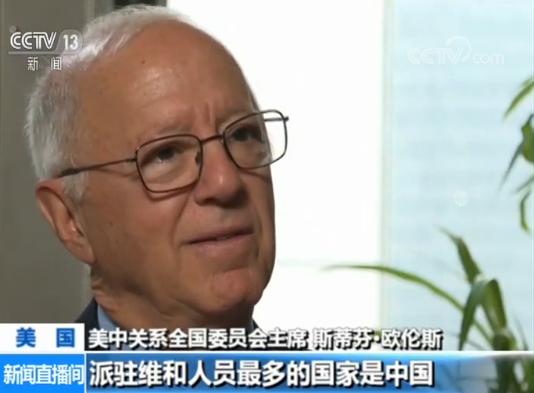 美中关系全国委员会主席 斯蒂芬·欧伦斯:中国在外交领域的很多贡献,在美国并没有得到广泛宣传报道。比如五个安理会常任理事国中,派驻维和人员最多的国家是中国,当我告诉我的美国朋友时,很多人都感到难以置信。
