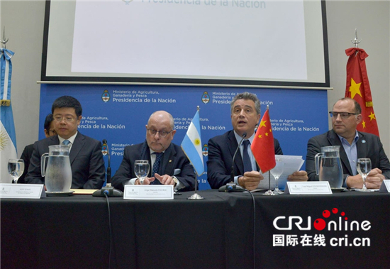 出席新闻发布会的中国驻阿根廷大使邹肖力(左一)、阿根廷外长福列(左二)和阿根廷农牧渔业部部长埃切韦雷(右二)