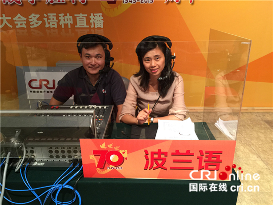 2015年9月3日,波兰语部副主任钟雷(左)和播音员赵霞参加纪念抗战胜利70周年阅兵广播直播。