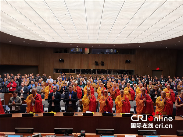 2019年10月12日,第二届中美加佛教论坛在纽约联合国总部举行。与会代表举行祈祷世界和平仪式。(摄影:钱珊铭)