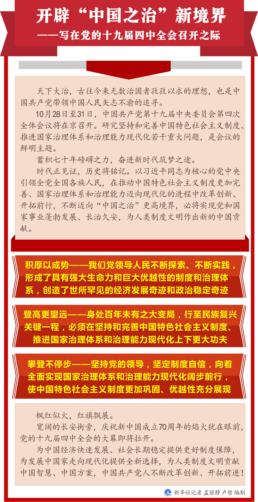 新华社北京10月27日电 题:开辟“中国之治”新境界——写在党的十九届四中全会召开之际