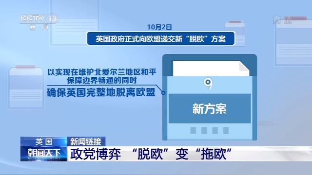 10月2号,英国政府正式向欧盟递交了新“脱欧”方案。按照新方案,英国不会在英国北爱尔兰地区与爱尔兰的“边界线上或附近”设置检查站,也会借助技术手段避免出现“硬边界”,以实现在维护北爱尔兰地区和平、保障边界畅通的同时确保英国完整地脱离欧盟。17号,时任欧盟委员会主席容克宣布,欧盟委员会与英国政府就英国“脱欧”达成协议。