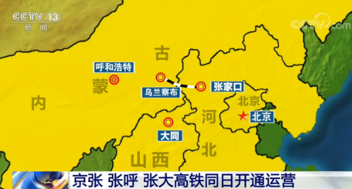 八纵八横高铁网中京兰通道的重要组成部分,京张高铁与张家口至呼和浩特高速铁路相连,成为内蒙古首条进京高铁,线路全长286.8公里,设计时速250公里。开通运营后,呼和浩特至北京的铁路运行时间将从现在的最快9个多小时,缩短至2小时09分。张家口至大同高速铁路是山西北部首条高铁,正线全长约134.4公里,设计时速250公里。开通运营后,北京至大同间的列车运行时间将由目前的6小时左右压缩至2小时左右。