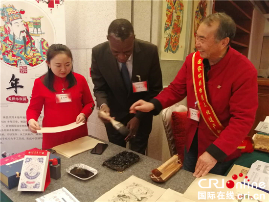 国家级非遗——凤翔木板年画的传承人邰立平(右)应邀指点国际友人体验年画技艺。魏郁摄