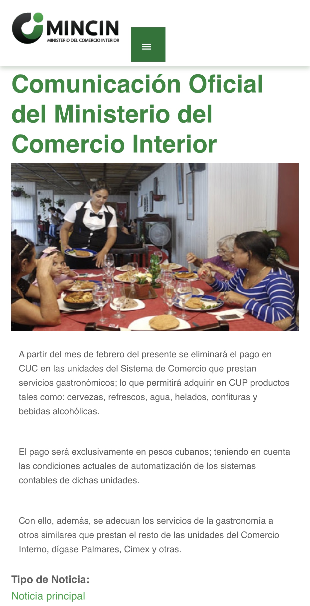 当地时间2月29日,古巴国内贸易部官方声明,即日起古巴国有餐饮行业交易系统中将取消可兑换比索(CUC)的支付,在饭店、咖啡厅、酒吧等餐饮场所购买啤酒、饮料、水、冰激凌、果酱和酒精饮料时将只能使用古巴比索(CUP)支付。此举是古巴政府向取消货币双轨制的方向迈进了一步。