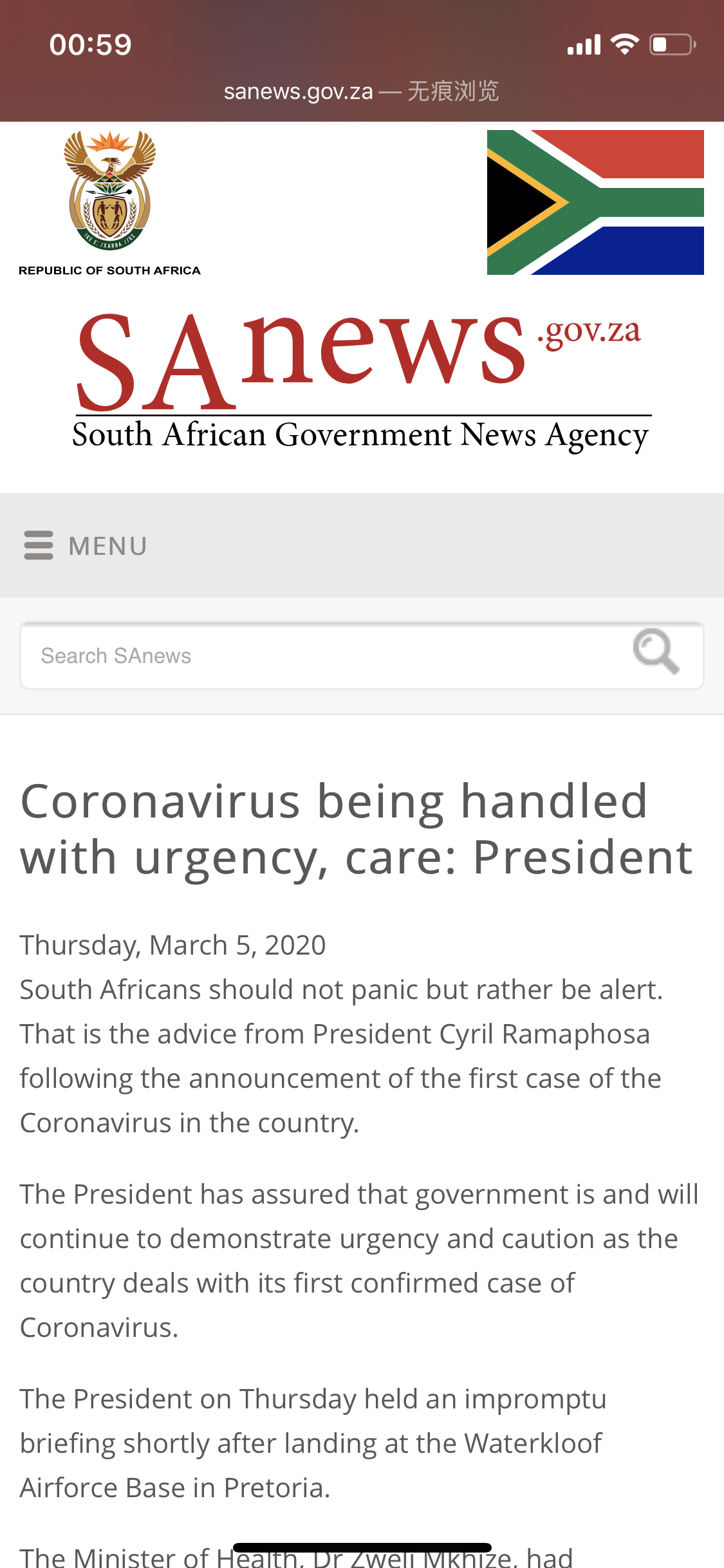 拉马福萨表示,南非政府将保持紧迫性,谨慎处理首例新冠肺炎确诊病例,避免假新闻的传播。他说,南非一直与世界卫生组织保持联系,还有在世卫组织工作的南非人,不断使南非了解这种病毒,“我们将继续公开和透明地向南非人民通报我们将采取的措施”。