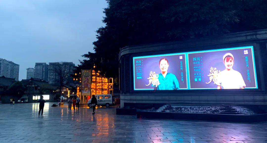 △四川成都在宽窄巷子东广场、春熙路阳光百货、人民南路城市之心、环球中心、机场大屏等处的户外大屏展播援助湖北女医护人员代表海报照片。