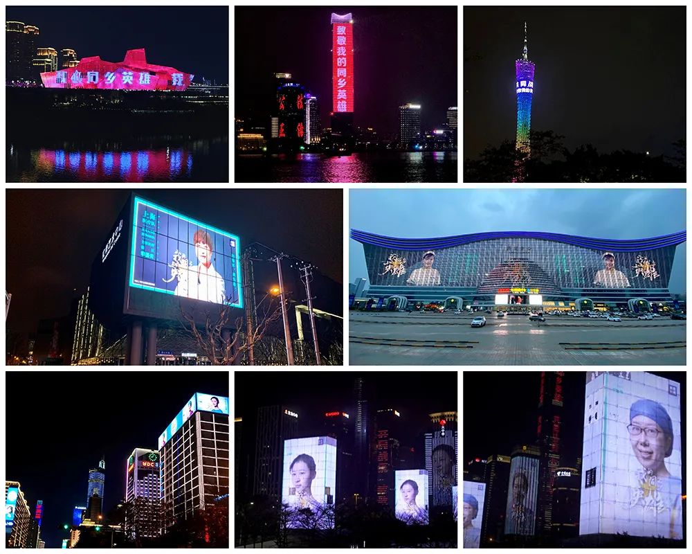 △广州在猎德大桥、广州国际媒体港、广州塔、花城广场、北京路等全市数百块户外大屏展播援助湖北女医护人员代表海报照片。
