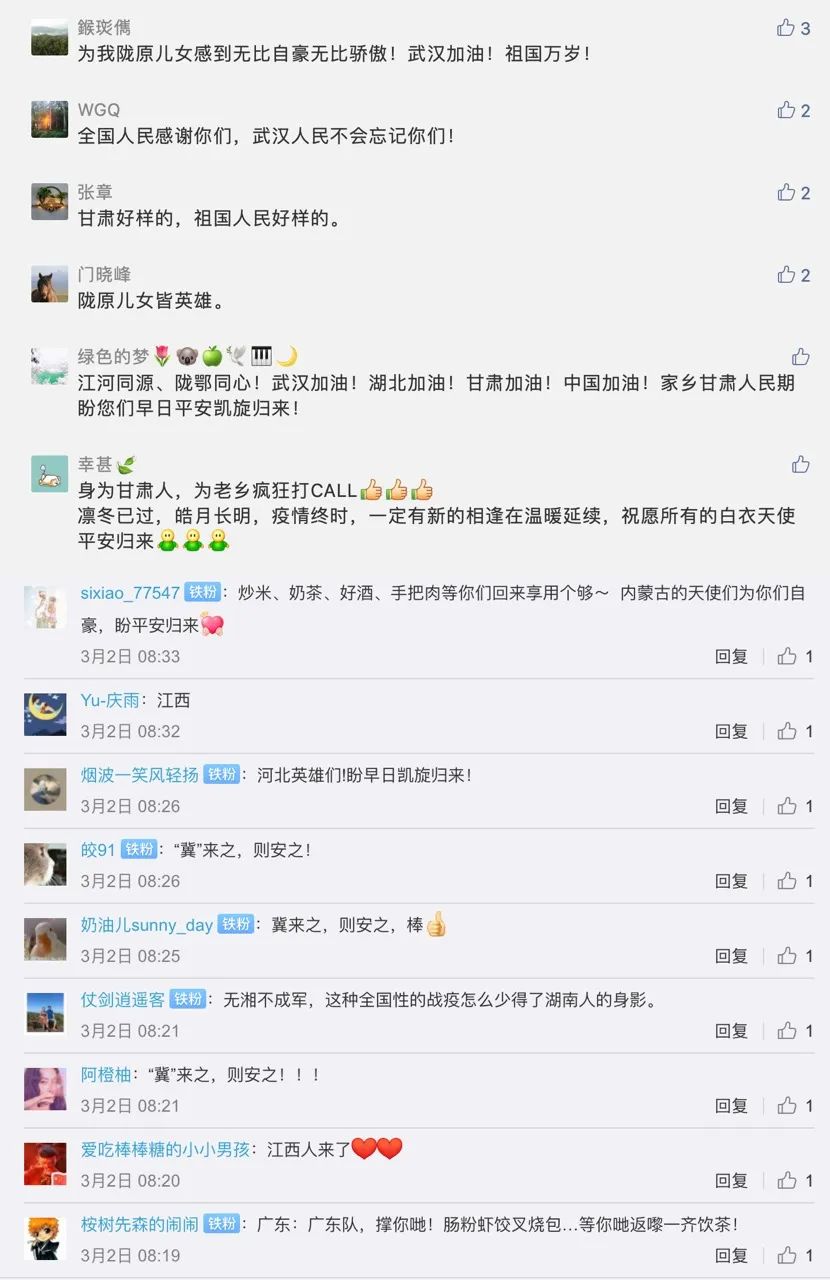 网友们纷纷留言为同乡英雄们打call“以一身白衣,舍一己安危,守一方平安!向白衣天使们,致敬!祝早日凯旋!”“凛冬已过,皓月长明,疫情终时,一定有新的相逢在温暖延续,祝愿所有的白衣天使平安归来!”其中有位名叫乔琦-Vision的网友说:“黄雯是我的夫人,我们全家在等你平安回家!加油武汉!加油中国!”