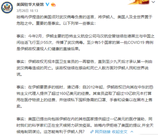 3月26日傍晚,美国驻华大使馆在官方微博把新冠病毒称为“武汉病毒”,称“哈梅内伊捏造的美国须对‘武汉病毒’负责的谣言将伊朗人、美国人及全世界置于危险之中”,并列举了4个“事实”,其中第一个“事实”就是伊朗“传播了‘武汉病毒’”;还称美国已提出向包括伊朗在内的其他国家提供超过一亿美元的医疗援助,哈梅内伊拒绝了美国的提议,并全天候炮制阴谋论。↓