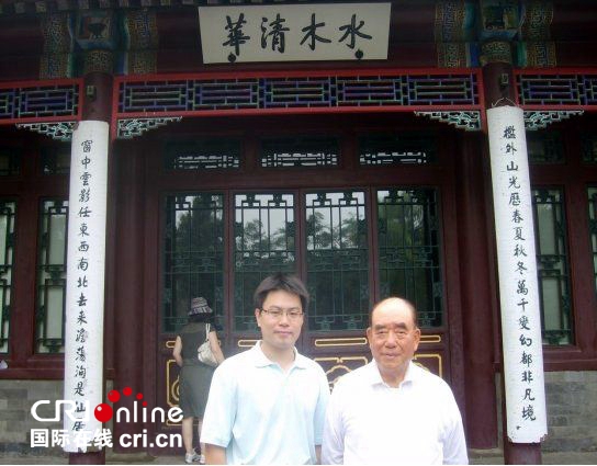 2009年8月上旬,郝柏村在九十高寿之时,带着几位家人和老友参访清华大学。图为郑振清(左)陪同郝柏村(右)参观校园时的合影。