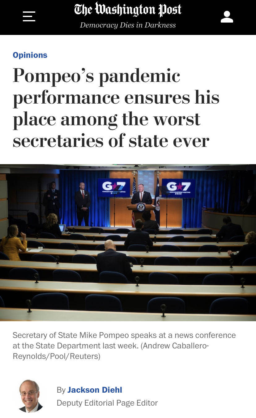 正如作者所说,这不是蓬佩奥一个人的错,因为他也只是为了取悦他的老板——特朗普。但这不会改变历史对这位国务卿的看法:蓬佩奥在疫情期间的表现,将使他位于有史以来最糟糕的国务卿之列。