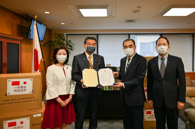 4月9日,中国驻日本大使孔铉佑与日本厚生劳动省副大臣桥本岳共同出席中国政府援助日本抗疫物资交接仪式。使馆杨宇公参及日本厚生劳动省大臣政务官自见英子等参加。