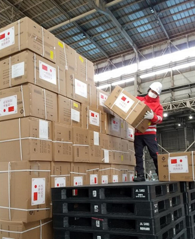 此系中国政府第二次向日本政府援助抗疫物资,包括N95口罩、医用外科口罩、医用隔离眼罩、防护服、防护面罩和手术衣等。有关物资于4月7日运抵东京。(总台记者 李卫兵)