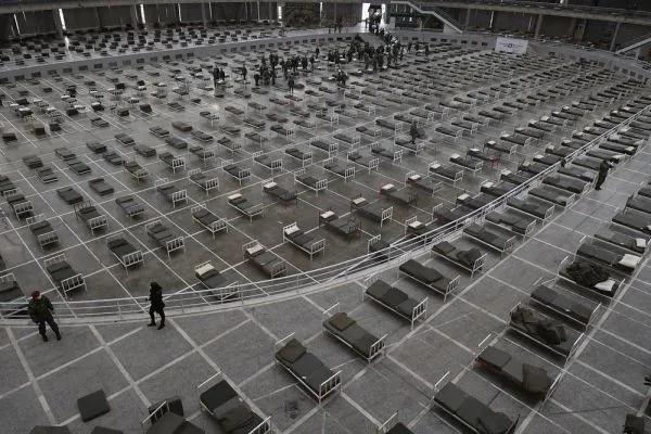 3月24日,在塞尔维亚首都贝尔格莱德,在中国专家组建议下,塞尔维亚士兵和工作人员为方舱医院组装病床。(新华社)