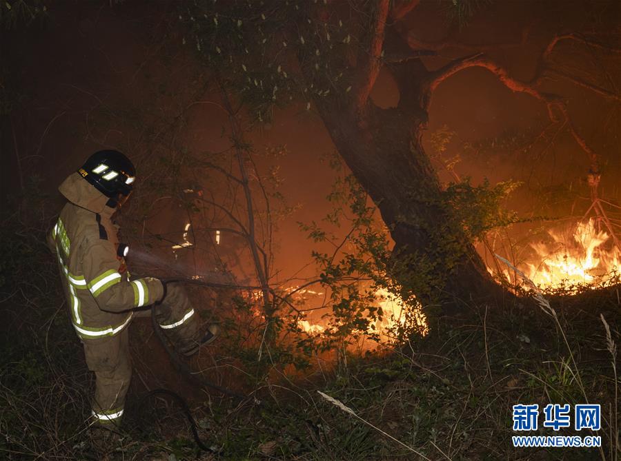 这是5月2日凌晨拍摄的山火。 据韩国消防部门2日通报,本周五晚间起火的韩国江原道高城郡山火今日被基本扑灭。本次火灾由高城郡的一座住宅起火引发,火势借强风迅速蔓延至临近山林。据韩国消防部门初步估计,约有85公顷的森林和6栋住宅被烧毁,驻扎在附近的1800多名军队士兵和300多名居民被疏散,目前没有造成人员伤亡。 新华社发(李相浩摄)
