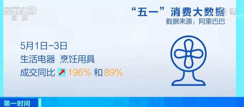 淘宝天猫数据显示,人们更加注重打造美好的家庭生活,5月1日至3日,生活电器、烹饪用具成交同比大增196%和89%。