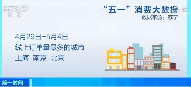 苏宁“五一”消费大数据显示,4月29日-5月4日,上海、南京、北京为线上订单量最多的城市;大件家电销售喜人,空调销量环比增长482%,冰箱销量环比增长310%,洗衣机销量环比增长342%。