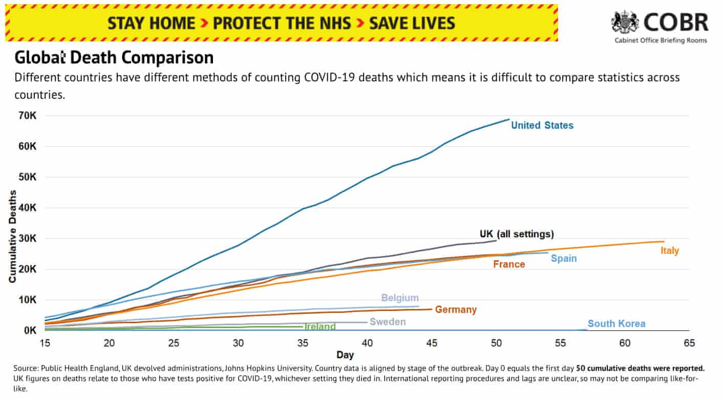 但是反对党领袖斯塔默挥舞着一张图表(上图)反击说,几周来政府一直在每日疫情发布会上用这样的疫情比较图表,现在说不能进行国际比较, "站不住脚"。