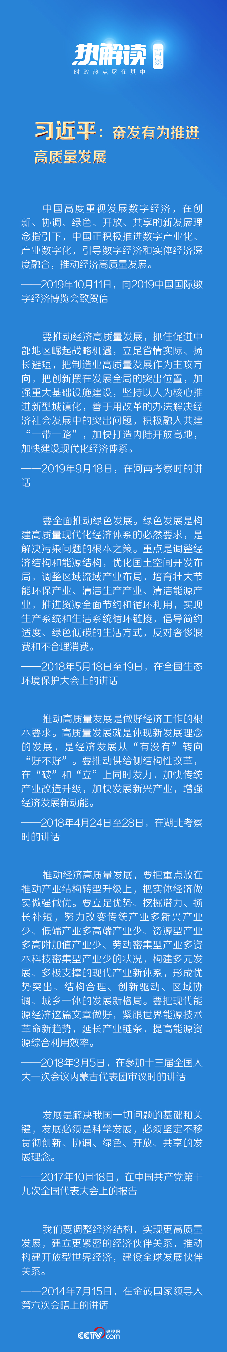 习近平曾指出:“推动高质量发展是做好经济工作的根本要求。高质量发展就是体现新发展理念的发展,是经济发展从‘有没有’转向‘好不好’。”他曾在不同场合多次强调高质量发展,并提出一系列具体要求。