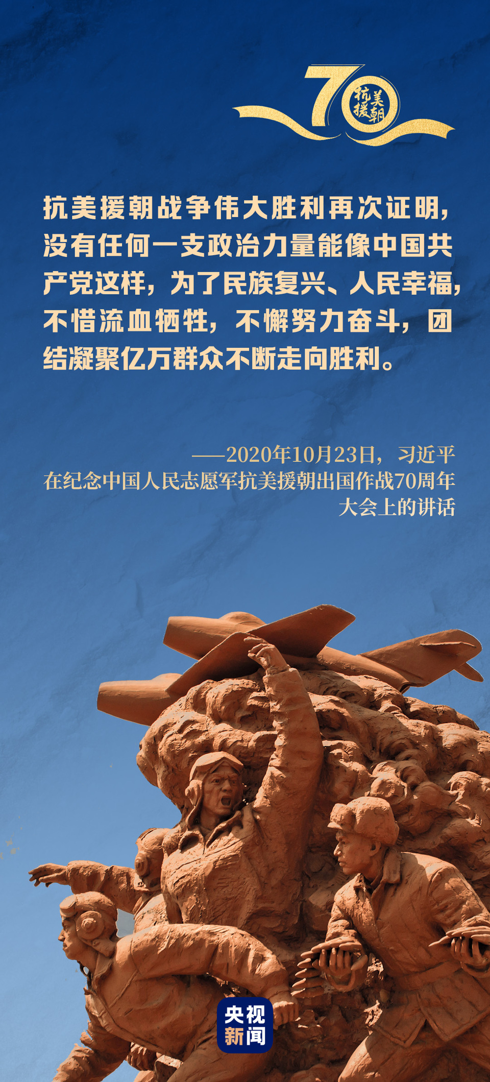 “1950年10月19日,中国人民志愿军在彭德怀司令员兼政治委员率领下进入朝鲜战场。这是以正义之师行正义之举。”“伟大的抗美援朝战争,抵御了帝国主义侵略扩张,捍卫了新中国安全,保卫了中国人民和平生活,稳定了朝鲜半岛局势,维护了亚洲和世界和平。”在讲话中,习近平充分肯定中国人民志愿军建立的不朽历史功勋。