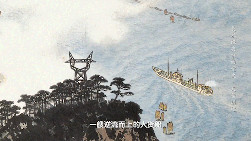 画面的右下角精心地刻画出碧波向前的江水,一艘逆流而上的大货船和几只帆船营造出一种江水奔腾不息的动感场景。