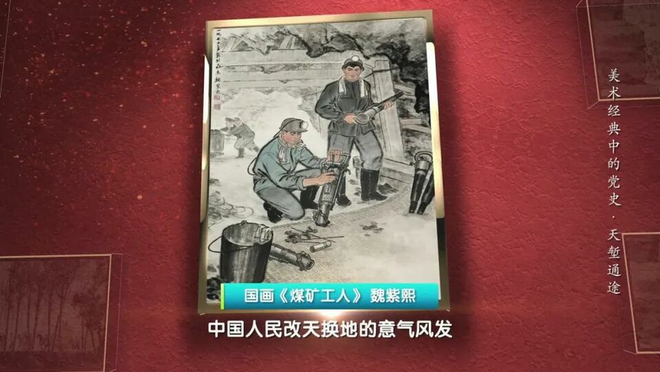 “ 画家将传统的中国画绘画技巧、意境,与这个新时代、新形象等生产建设的场景相结合,绘制了一幅气势磅礴的现代山水画作。”