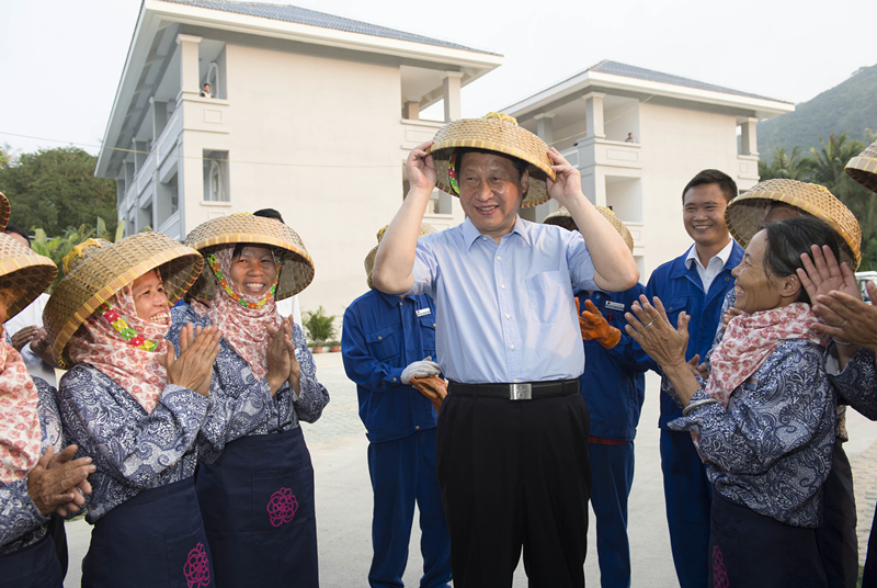 2013年4月9日,习近平总书记在亚龙湾兰德玫瑰风情产业园高兴地戴上黎族群众递上的竹笠。