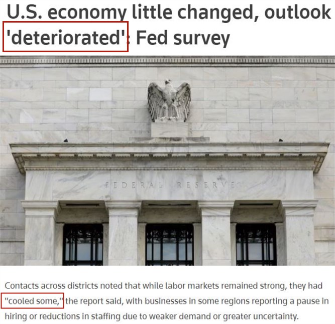 △路透社:美联储日前发布的全国经济形势调查报告(褐皮书)显示,近几周以来,美国经济前景较以往更为低迷,就业增长“出现冷却迹象”。在一些地方,由于需求疲软、不确定性增加,不少企业已计划暂停招聘或开始裁员。
